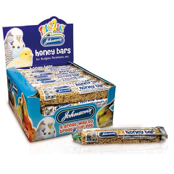 Johnsons Veterinary Budgie & Parakeets Honey Treat Bar 35g The Johnsons budgie & parakeet honey bars are a complementary pet food,only give as a supplement to the normal diet. These honey bars are ideal for smaller cage birds like budgies and parakeets. Another great pleasure for Budgies; this bar shaped treat is made with carefully selected seeds and is enriched with honey. Comes complete with plastic hanging clip, to suspend or place in cage or avairy. Key Benefits Suitable for budgies and parakeets Enriched seeds coated with honey Hanging clip for easy hanging Weight - 35g